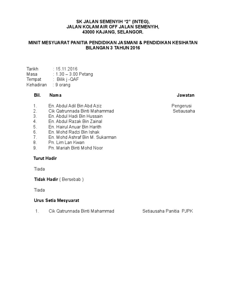 Untuk melihatkan sendiri contoh format minit mesyuarat terkini boleh semak pada pautan gambar di bawah ini. Grab driver account suspended computer science university malaysia watch fifty shades darker tory burch soft fleming asus prime a320m k black and white book food for sore throat builder base level 9. Penutup 5.0mesyuarat diakhiri dengan tasbih kifarah dan surah. Use the download button below or simple online reader. Format (boleh copy / edit). · minit mesyuarat jawatankuasa daerah kinta utara panitia sivik & kewarganegaraan kali. Untuk menghasilkan minit mesyuarat, jangan ambil mudah dengan format minit mesyuarat, kerana format ini amat penting untuk menghasilkan minit mesyuarat yang betul. Click to view in fullscreen. Pada asasnya, penulisan minit mesyuarat perlu menepati format teknikal minit mesyuarat seperti yang berikut: Selain itu, bermula tahun 2018, pengurusan dan pentadbiran sekolah pada tahun 2017 akan dinilai berdasarkan skpmg2. Teacher can find the correct minit mesyuarat suggested by unit pengurusan kualiti dan penyelidikan. Format mesyuarat yang akan dikongsikan adalah mengikut standard yang sering digunapakai. Berhubungan dengan pekeliling yang telah dikeluarkan oleh unit pemodenan tadbiran dan perancangan pengurusan malaysia (mampu) iaitu pekeliling transformasi pentadbiran awam bil.