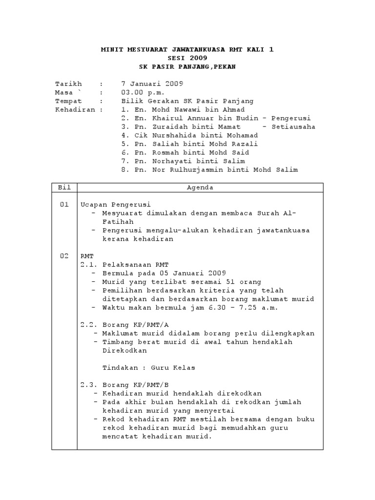 Format minit disusun mengikut agenda mesyuarat dan perlu kelihatan kemas dan teratur. · minit mesyuarat jawatankuasa daerah kinta utara panitia sivik & kewarganegaraan kali. Jika tiada catatan, segala perbincangan tidak akan ada tindakan susulan. Berhubungan dengan pekeliling yang telah dikeluarkan oleh unit pemodenan tadbiran dan perancangan pengurusan malaysia (mampu) iaitu pekeliling transformasi pentadbiran awam bil. Contoh minit bagi edisi terdahulu pembinaan minit mesyuarat biasanya tidaklah. Kp mampu bil 6 2014 1. Minit mesyuarat penting kerana minit merupakan sumber rujukan masa hadapan. Format penulisan minit mesyuarat pengenalan 1. Jika tiada catatan, segala perbincangan tidak akan ada tindakan contoh minit mesyuarat syarikat. Mesyuarat merupakan satu prosedur pentadbiran yang wajib dilakukan oleh setiap pengurusan sekolah. Format tidak terlalu berbeza tidak kira anda mesyuarat anda adalah mesyuarat panatia subjek, mesyuarat pibg, meeting kokurikulum, mesyuarat sukan. Use the download button below or simple online reader. (catatkan nama mesyuarat dan bilangan mesyuarat).