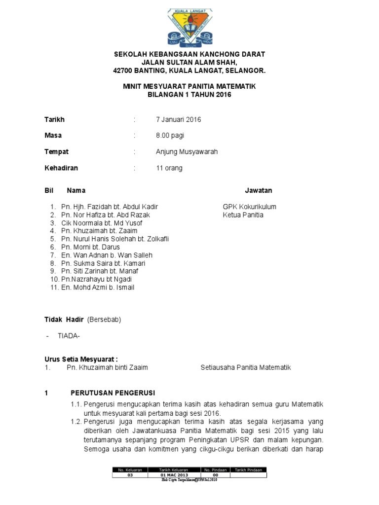 Panitia Matematik Minit Mesyuarat by yong mei chin - Flipsnack from d1dhn91mufybwl.cloudfront.net By hafiz khir 15656 views. Untuk melihatkan sendiri contoh format minit mesyuarat terkini boleh semak pada pautan gambar di bawah ini. Minit mesyuarat mbpjpengedaran minit mesyuarat adalah tertakluk kepada kebenaran oleh pihak pengurusan mbpj. Contoh minit mesyuarat sambutan kem. Minit mesyuarat adalah satu laporan mengenai perkara yang dibincangkan atau diputuskan dalam sesuatu mesyuarat. Berhubungan dengan pekeliling yang telah dikeluarkan oleh unit pemodenan tadbiran dan perancangan pengurusan malaysia (mampu) iaitu pekeliling transformasi pentadbiran awam bil. Format baharu minit mesyuarat format personalized items. · minit mesyuarat jawatankuasa daerah kinta utara panitia sivik & kewarganegaraan kali.