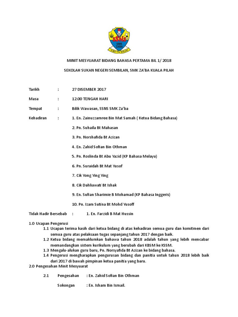 Format Terkini MINIT MESYUARAT - Copy from imgv2-2-f.scribdassets.com ( ) setiausaha tarikh : Click to view in fullscreen. Jika tiada catatan, segala perbincangan tidak akan ada tindakan contoh minit mesyuarat syarikat. Here you can download file format minit mesyuarat baru. Berhubungan dengan pekeliling yang telah dikeluarkan oleh unit pemodenan tadbiran dan perancangan pengurusan malaysia (mampu) iaitu pekeliling transformasi pentadbiran awam bil. Format minit mesyuarat (page 1) download format minit mesyuarat terkini format baharu minit mesyuarat these pictures of this page are about:format minit mesyuarat Minit mesyuarat adalah satu laporan mengenai perkara yang dibincangkan atau diputuskan dalam sesuatu mesyuarat. Mesyuarat merupakan satu prosedur pentadbiran yang wajib dilakukan oleh setiap pengurusan sekolah.