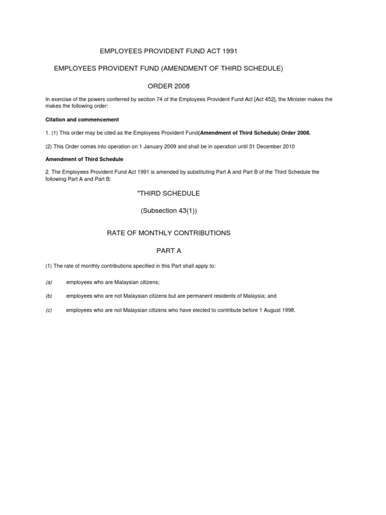 Kwsp) is a the malaysian epf was formally founded after the enactment of the employees provident fund act 1991 (act 452), which grants employees. An act to make provision for the establishment of the central provident fund board and a central provident fund. It is administered and managed by the central board of trustees that consists of representatives from three parties, namely, the government, the employers and the. Here, we have broken down the concept in terms of definition, understanding, and importance of employee under the epf act, all organisations with more than 20 employees are required to register with the epfo. Transfer of powers, rights, liabilities and duties. Amendments to part a and part b. It was enacted to provide compulsory benefits to the retired employees or benefits to the family of the employee who died other than natural death. The employees provident fund (epf) clarifies that the reduction of the reduction of contribution rate from 5.5% to 4% is subject to the amount of wage/salary as stipulated in part c and part d of the employees provident fund order (amendments to the third schedule) 2016, epf act 1991. Amount of wages for the month. It manages the compulsory savings plan and retirement planning for private sector workers in malaysia. Employees provident fund act 1991 act 452. Schedule, employee, fund, third, provident, employees provident fund, third schedule. Employees' provident fund in india.