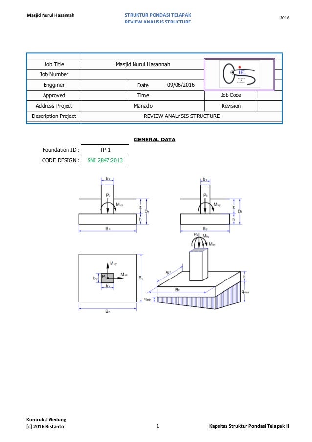 Http Www Ocw Upj Ac Id Files Slide Cvl109 Cvl109 Slide 08 Pdf from Pondasi foot plate biasa disebut sebagai pondasi tapak. Pengertian pondasi foot plat pondasi telapak (foot plat) biasanya dipakai pada bangunan lantai 2 keatas, akan tetapi tidak menutup kemungkinan digunakan pada bangunan rumah lantai 1 (melihat kondisi tanah), akan tetapi sangat jarang sekali digunakan. Contoh perhitungan penulangan pondasi telapak. Pondasi foot plat dipergunakan pada kondisi tanah dengan daya dukung tanah (sigma) antara : Info tentang pondasi footplat untuk rumah 2 lantai. Cara menghitung jumlah besi pondasi setempat (pondasi foot plat). Pondasi foot plat atau juga disebut pondasi telapak pondasi foot plat /pondasi telapak salam hangat berikut cara perhitungan pembesian pada pekerjaan pondasi tapak ataupun footplate 10:17. Tebal plat beton yang digunakan kurang lebih 10 sampai 20 cm, dan pipa buis beton yang digunakan memiliki diameter 20 cm ketebalan 8 cm dengan panjang sekitar 150 sampai 250 cm.